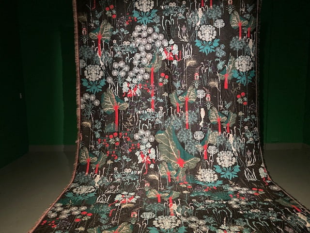 Teoksissa käytetään villaa, silkkiä, kumia, kuparia, polyesteriä, metallinhohtoisia lankoja, glitteriä… Kun houkutus koskea teoksiin on suuri, oppaalla oli tarjota jacquard-tekniikalla kudottuja tilkkuja hypisteltäväksi. Näyttelyn teosten villit kuviot ja teosten mittasuhteet olivat ajaa kudontamestarit epätoivon partaalle!