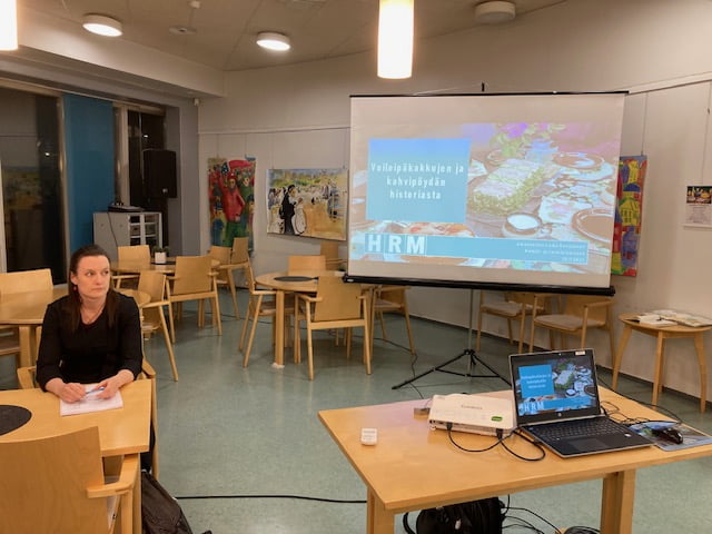Kekrin vietossa tutustuimme Hotelli- ja ravintolamuseon amanuenssi Laika Nevalaisen johdolla kahvipöytien tarjottaviin. Juuret voileipäpöytään juontavat jo 1700-luvulle, jolloin myös kahvi tuli Suomeen toki vain juhlapäivinä tarjottavaksi juomaksi. Isot varallisuuserot vaikuttivat kahvipöytien valikoimien laajuuteen, sillä vehnä oli tuontitavaraa, sokeri kallista ja voita oli tarjolla harvemmin. Yleisen elintason nousun myötä 1900-luvulla kahvipöytiin alkoivat ilmestyä voileipien lisäksi pullakranssit, kuivakakut ja pikkuleivät. Voileipäkakku tuli Ruotsista Suomeen 1950 luvulla ja 1956 ilmestyikin ensimmäinen ohje Kotiliesi lehteen. Itsenäisyyspäivän linnan juhlissa voileipäkakkua tarjottiin ensimmäisen kerran vuonna 1961.