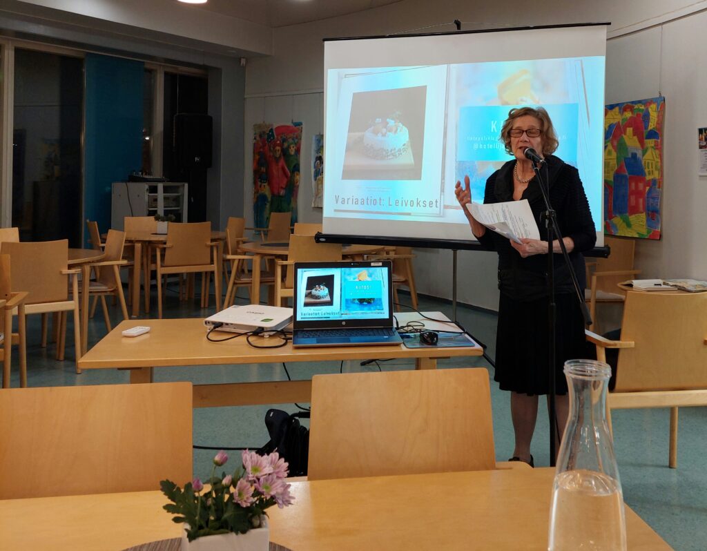 Raija Vesterinen kertoi meille itäisen ja läntisen ruokakulttuurin eroista sekä lapsuutensa ajan (1940-luvun lopun) hämäläisestä pitopöydästä. Suomi toimii kahden eri kulttuurialueen välissä, ikään kuin idän ja lännen yhdistäjänä rajan kulkiessa Suomenlahden pohjukasta Pohjanlahden pohjukkaan. Ruokakulttuurilla tarkoitetaan tässä talonpoikaisväestön säilyttämää tieto- ja taitoperinnettä. Ero alueiden välillä perustui suurelta osin erilaiseen uunityyppiin ja uunin erilaiseen käyttöön. Lännessä leivän paisto ja ruoan laitto eriytyivät asuinhuoneesta eli pirtistä. Asuinhuoneen uuni oli vain lämmitystä varten, siinä ei voinut tehdä ruokaa, leivinuuni oli erikseen eri tilassa. Tavallisimmin ruoka keitettiin tai haudutettiin padassa liedellä. Ruisleipää leivottiin harvoin, noin kaksi, kolme kertaa vuodessa ja leivät kuivattiin orressa. Isommissa taloissa oli erillinen pakari leipomista ja ruoan laittoa varten. Idässä leivinuuni sijaitsi asuintuvassa ja sitä käytettiin myös lämmitykseen. Kun tupaa talvella lämmitettiin päivittäin, samalla valmistettiin pehmeää leipää, piirakoita, kukkoja ja jälkilämmössä haudutettiin ruokia.