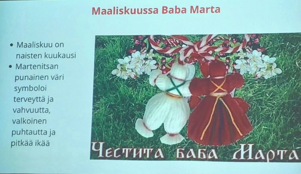 Saimme Anne-Marie Grouevin esitelmöimään meille 22.4. Bulgarian kansanperinteistä ja kulttuurista. Aluksi pieni historian kertaus oli paikallaan. Alueelta löytyi asumisen merkkejä jo noin 6000 v. ennen ajanlaskun alkua. Sitä valloittivat ja hallitsivat useat kansat mm. roomalaiset ja he tekivät siitä n. vuonna 46 Rooman provinssin. Kerrotaan peräti keisari Augustuksen olleen ihastunut maahan sen rikkaiden mineraalivesien vuoksi! Roomalaisten rakentamia muistomerkkejä voi nähdä vielä tänäkin päivänä Bulgarian alueella.