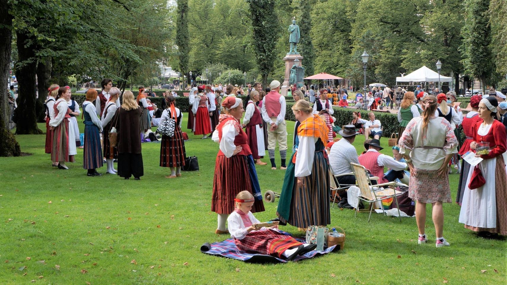 Suur-Helsingin Kalevalaiset Naiset ja Föreningen Brage olivat kutsuneet kaikkia kiinnostuneita Espan puistoon tuulettamaan kansallispukua tai osaa siitä.