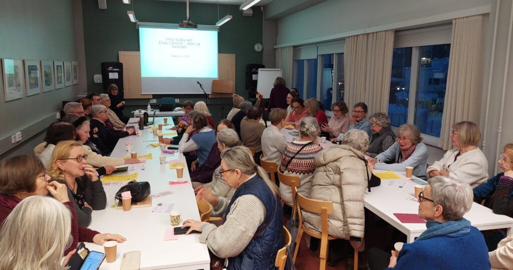 Kalevalan päiväviikon kunniaksi 23.2. saimme FT, professori emerita Irma Sulkusen esitelmöimään meille Elias Lönnrotista kirjoittamastaan teoksesta Elias Lönnrot ja hänen pitkä varjonsa. Sulkunen kertoi aluksi pohdiskelleensa, miksi ja millaisessa tilanteessa Lönnrotista tuli kansakunnan merkkihenkilö ja toisaalta – puhutteleeko Lönnrot nykyihmistä lainkaan. Vielä häntä askarrutti kysymys, onko enää tarpeen lähteä kaivelemaan jotain muuta, jos kerta Lönnrotille on jo vakiintunut kansallisen merkkihenkilön ”ikoninen” asema. Vuosien mittaan eri teoksia tutkiessaan hän oli kuitenkin havainnut saman perustarinan toistuvan, köyhä ja lahjakas räätälinpoika kohosi yliopiston professoriksi ja Kalevalan kokoajaksi.